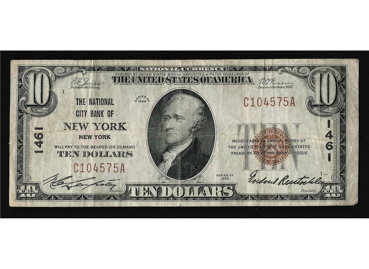 One 1929 $10 National City Bank of New York, NY National Currency Note.
