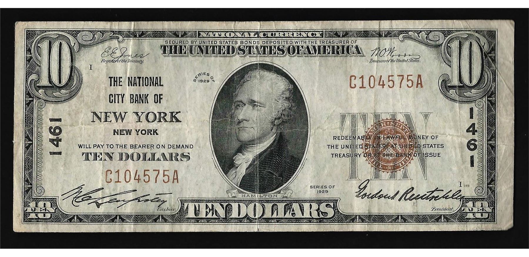 One 1929 $10 National City Bank of New York, NY National Currency Note.
