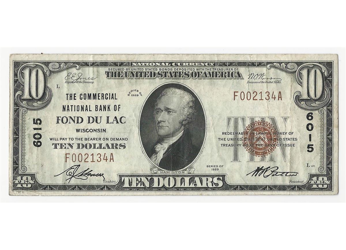 One 1929 $10 National Currency Fond Du Lac WI Bank Note.