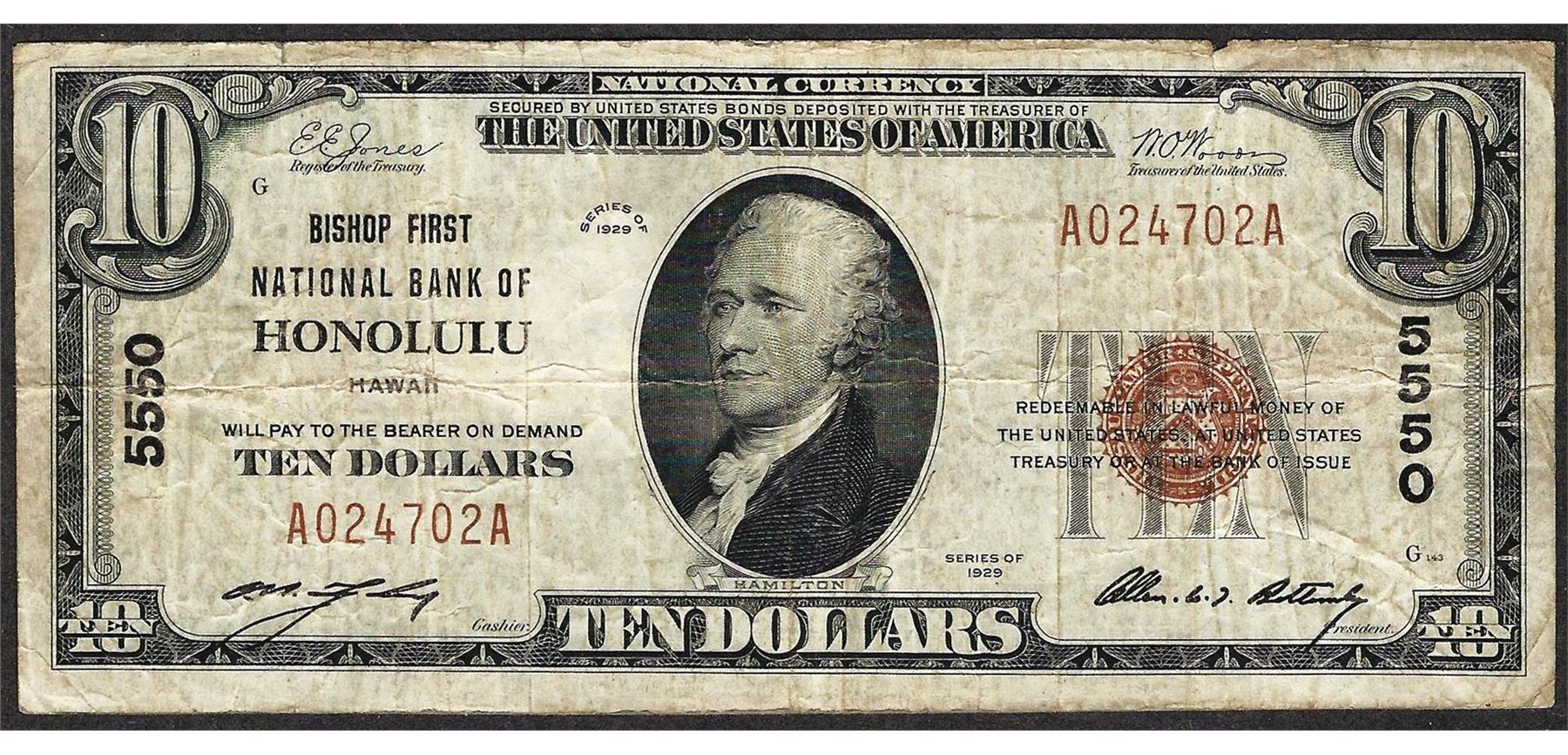 One 1929 $10 National Currency Note Bishop NB of Honolulu, HI CH# 5550.