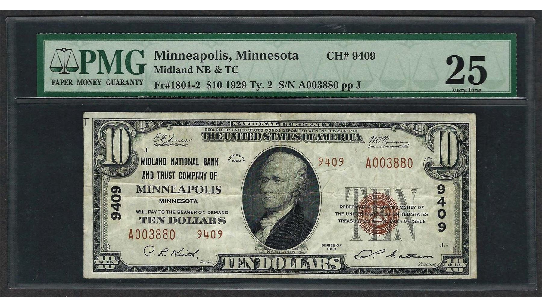 1929 $10 National Currency Note Minneapolis, Minnesota CH# 9409 PMG Very Fine 25
