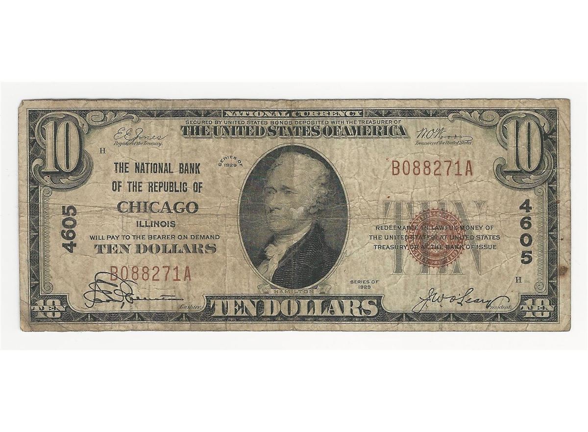 One 1929 $10 National Currency The National Bank of the Republic of Chicago Note.