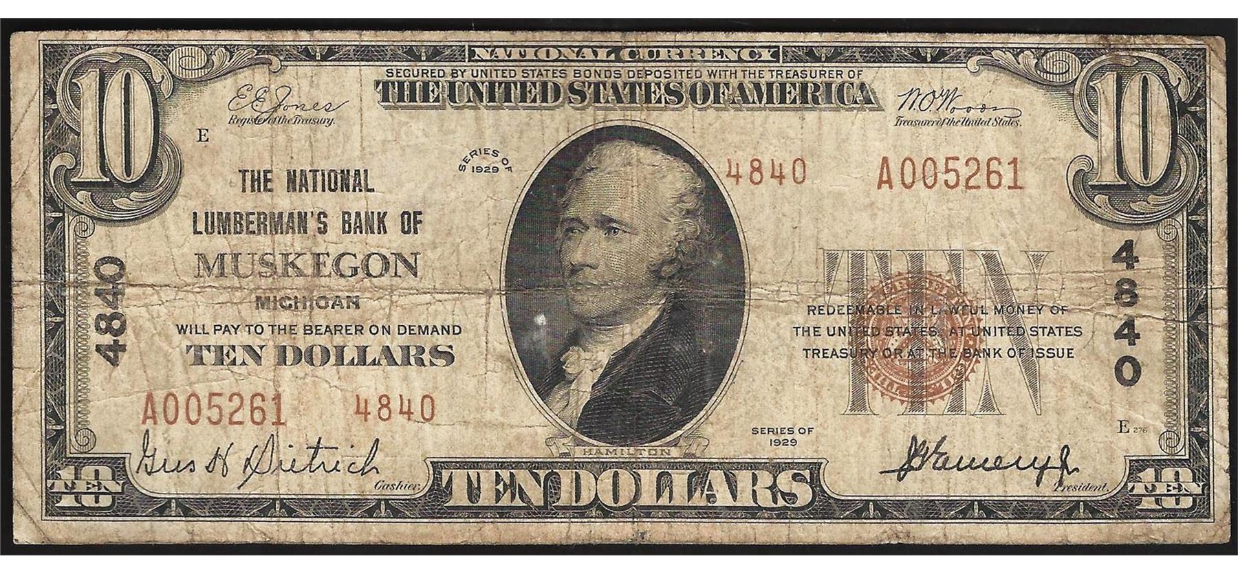 1929 $10 National Lumbermans Bank of Muskegon MI National Currency Note CH# 4840