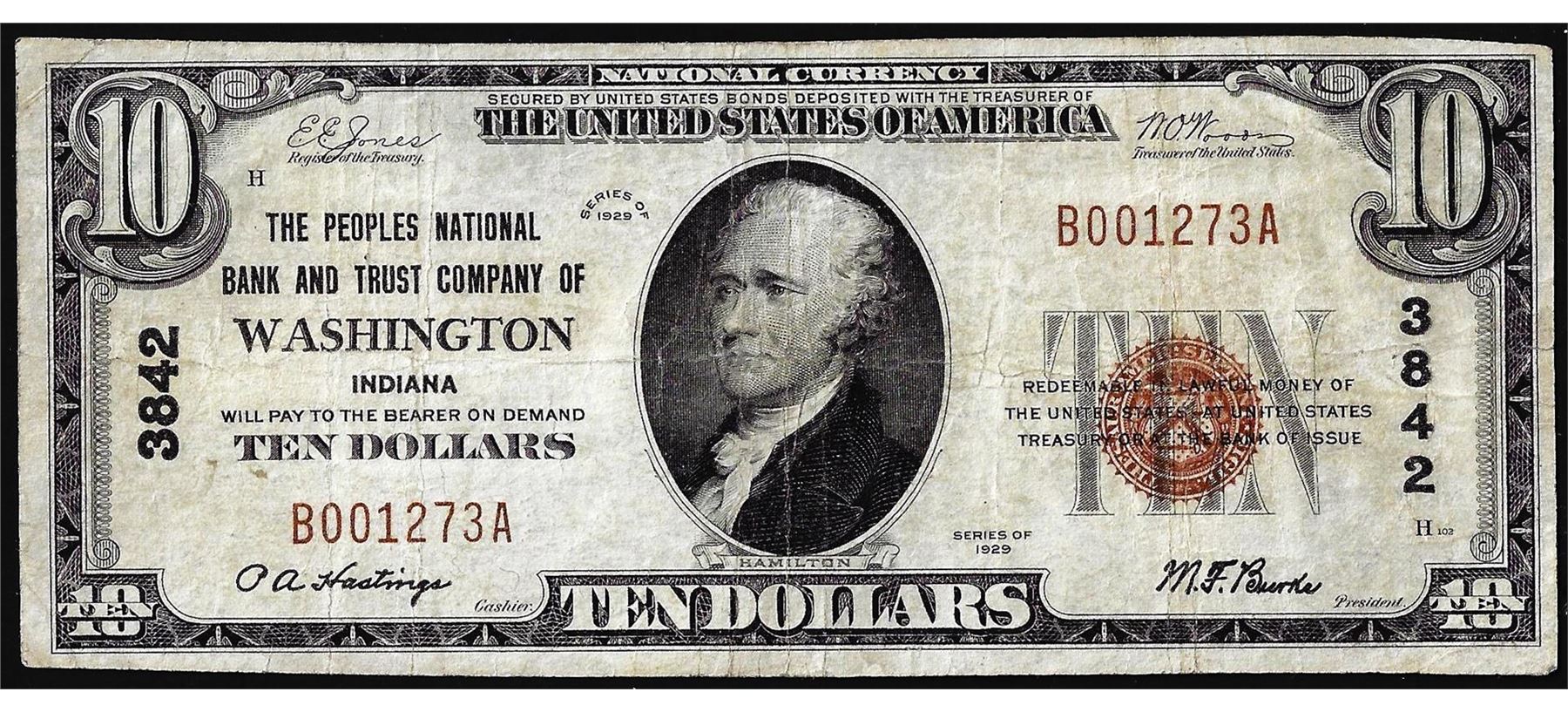 One 1929 $10 Peoples Bank & Trust of Washington, Indiana CH# 3842 National Currency Note.