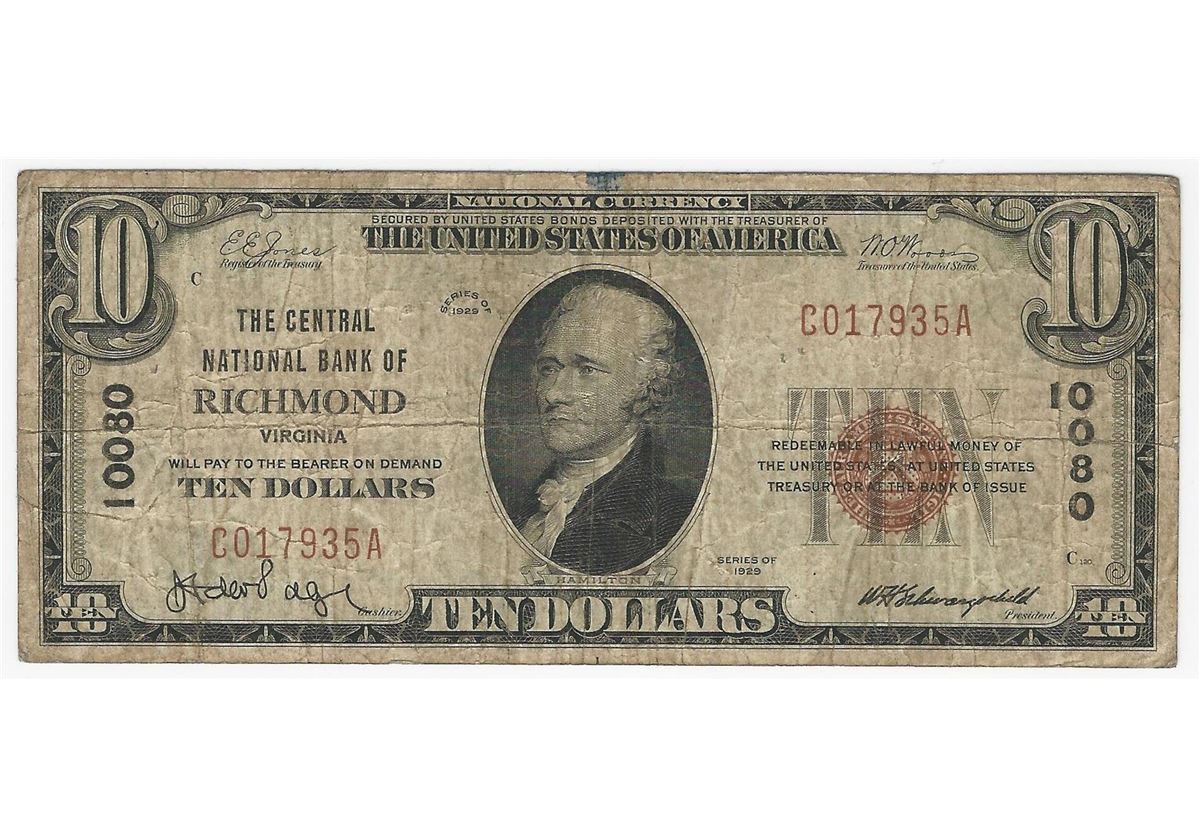 One 1929 $10 Richmond Virginia National Currency Note.
