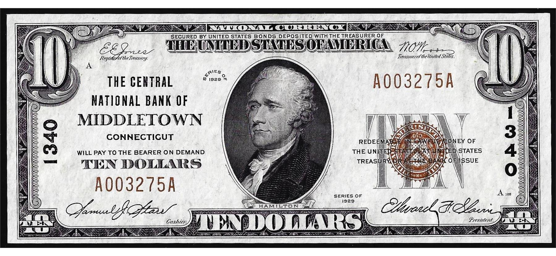 One 1929 $10 The Central National Bank of Middletown, CT CH# 1340 National Currency Note.