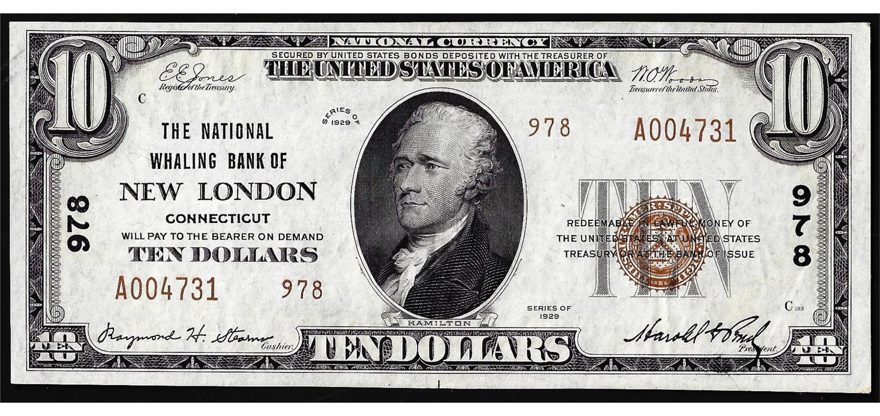 1929 $10 The National Whaling Bank of New London, CT CH# 978 National Currency Note