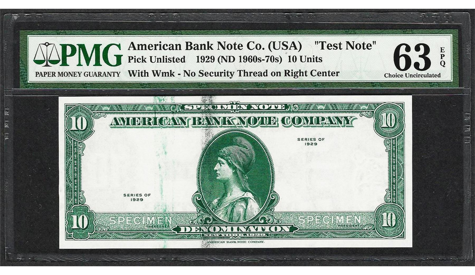 One 1929 10 Unit American Bank Note Co. "Test Note" PMG Choice Uncirculated 63EPQ. PMG Certified.