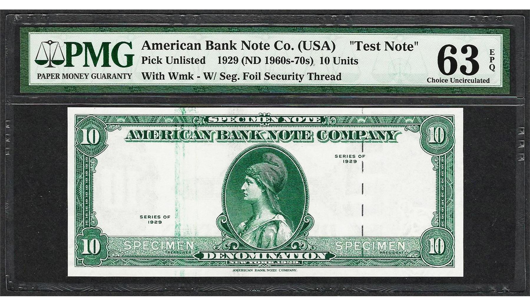 One 1929 10 Unit American Bank Note Co. "Test Note" PMG Choice Uncirculated 63EPQ. PMG Certified.