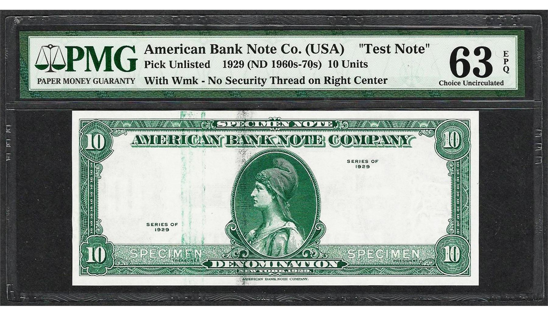 One 1929 10 Unit American Bank Note Co. "Test Note" PMG Choice Uncirculated 63EPQ. PMG Certified.