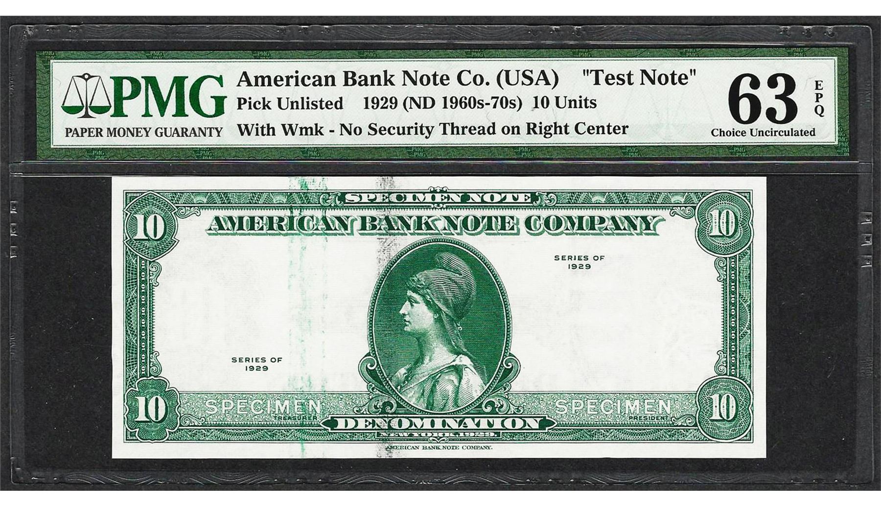 One 1929 10 Unit American Bank Note Co. "Test Note" PMG Choice Uncirculated 63EPQ. PMG Certified.