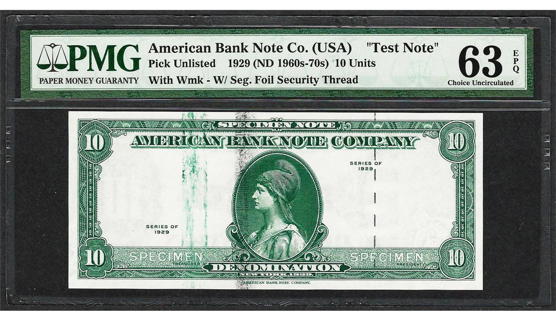 One 1929 10 Unit American Bank Note Co. "Test Note" PMG Choice Uncirculated 63EPQ. PMG Certified.