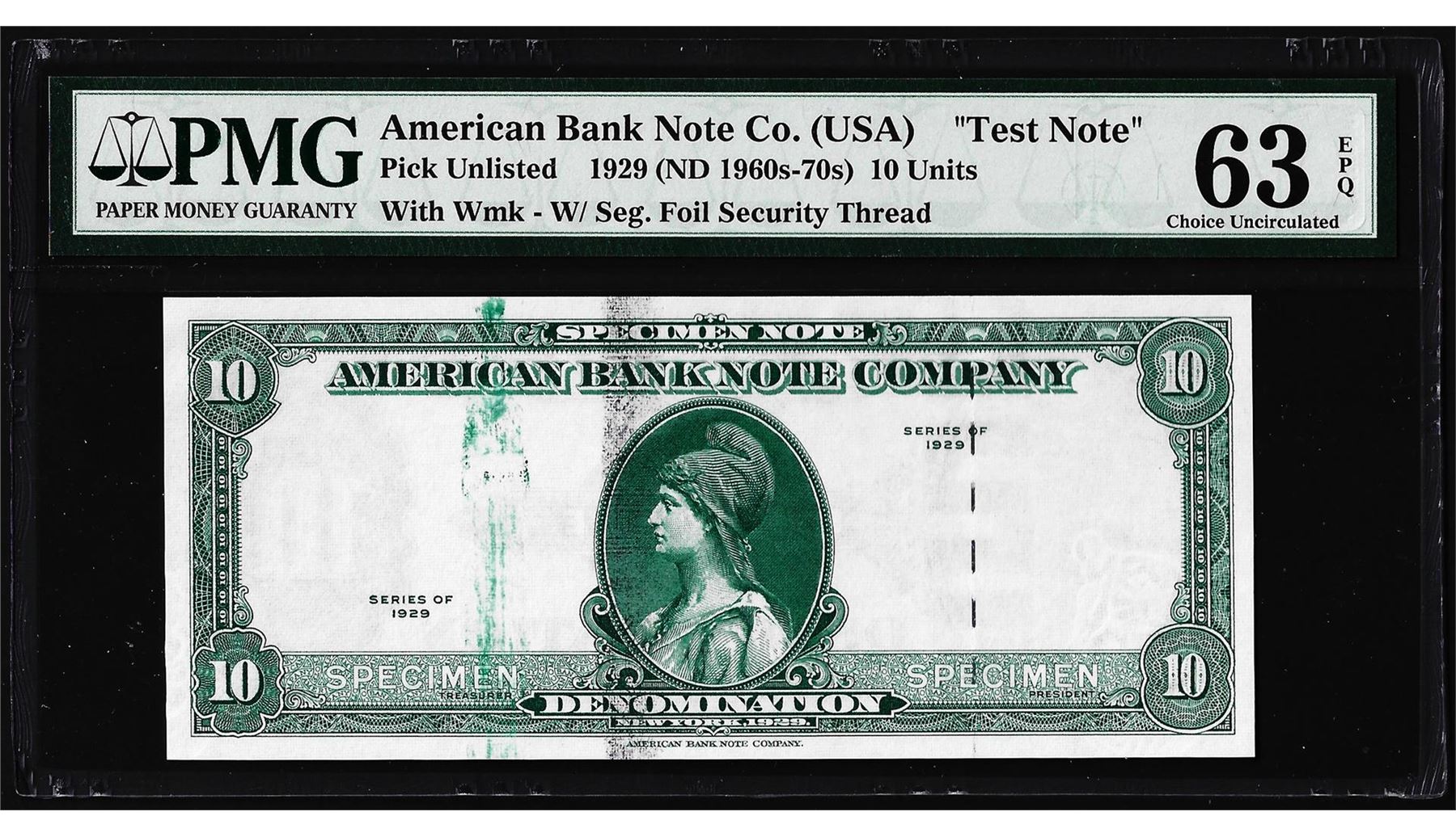 One 1929 10 Unit American Bank Note Co. "Test Note" PMG Choice Uncirculated 63EPQ. PMG Certified.