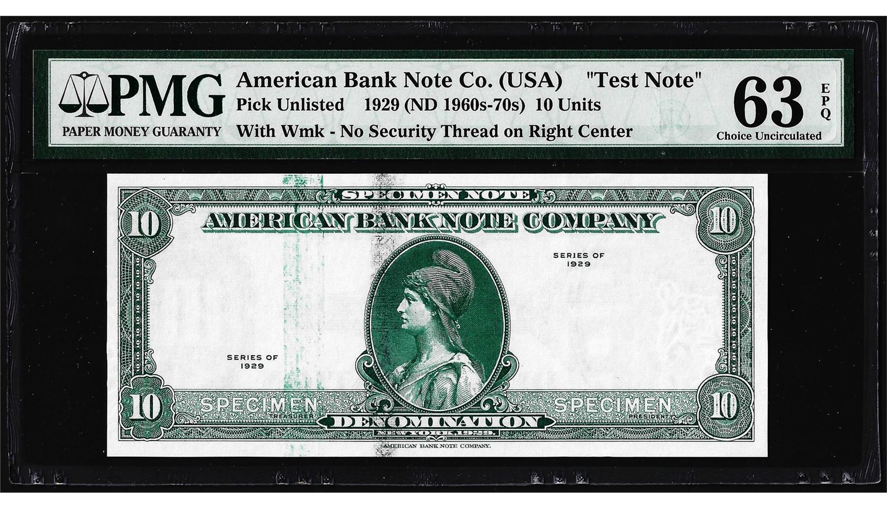 One 1929 10 Unit American Bank Note Co. "Test Note" PMG Choice Uncirculated 63EPQ. PMG Certified.