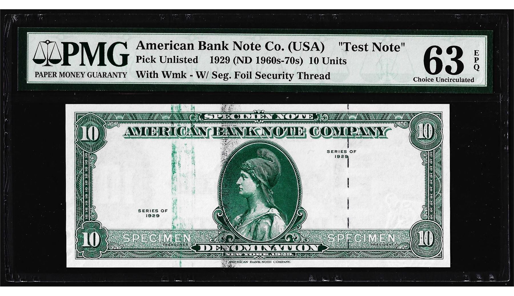 One 1929 10 Unit American Bank Note Co. "Test Note" PMG Choice Uncirculated 63EPQ. PMG Certified.