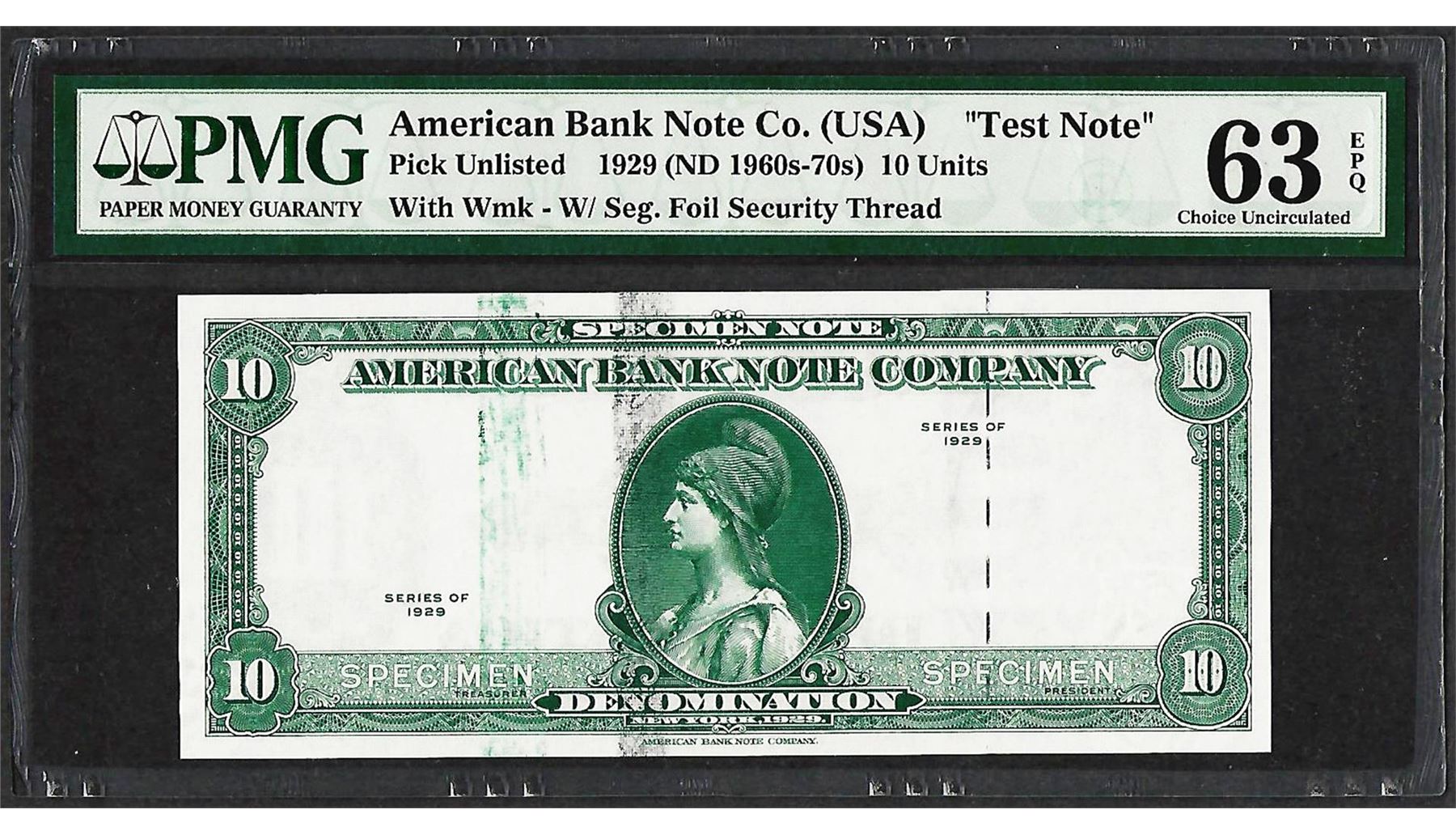 One 1929 10 Unit American Bank Note Co. "Test Note" PMG Choice Uncirculated 63EPQ. PMG Certified.