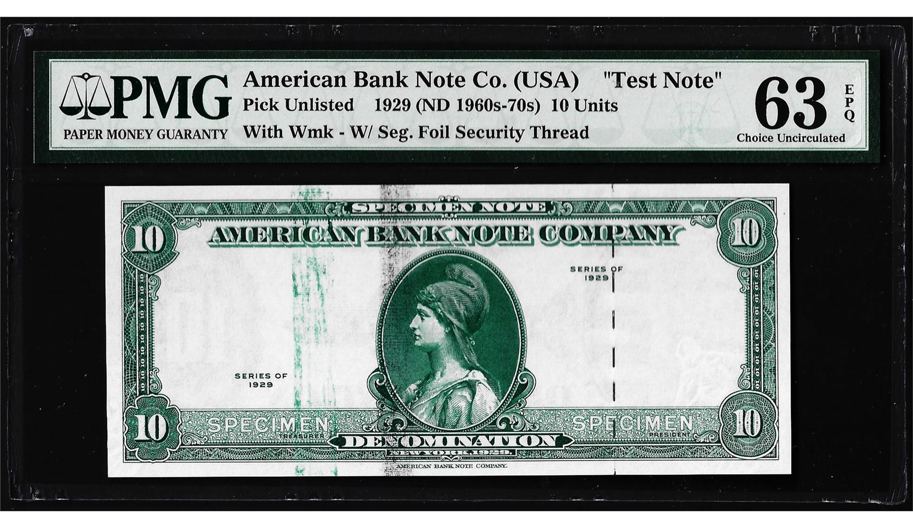 One 1929 10 Unit American Bank Note Co. "Test Note" PMG Choice Uncirculated 63EPQ. PMG Certified.
