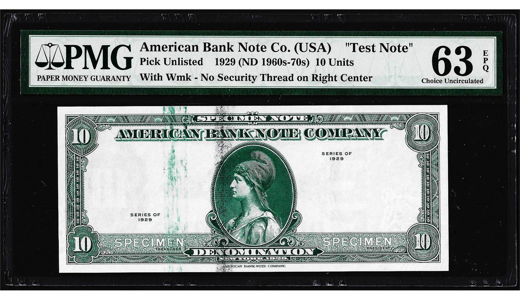 One 1929 10 Unit American Bank Note Co. "Test Note" PMG Choice Uncirculated 63EPQ. PMG Certified.
