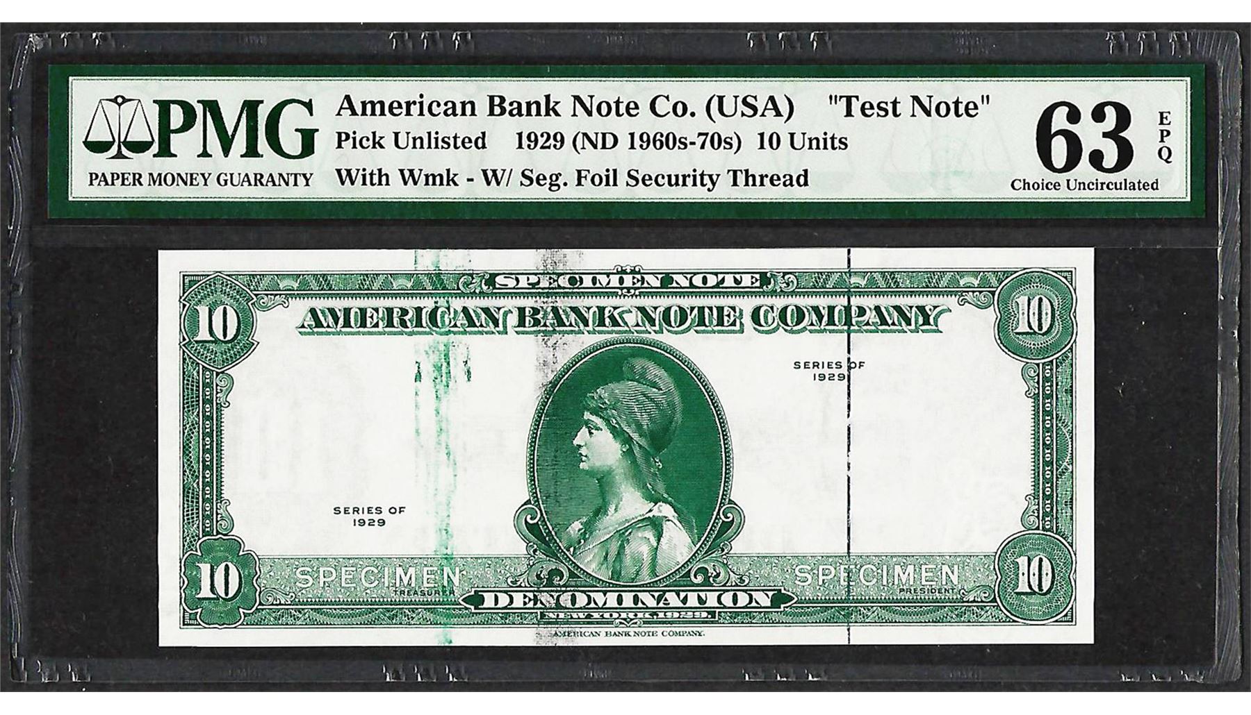 One 1929 10 Unit American Bank Note Co. "Test Note" PMG Choice Uncirculated 63EPQ. PMG Certified.