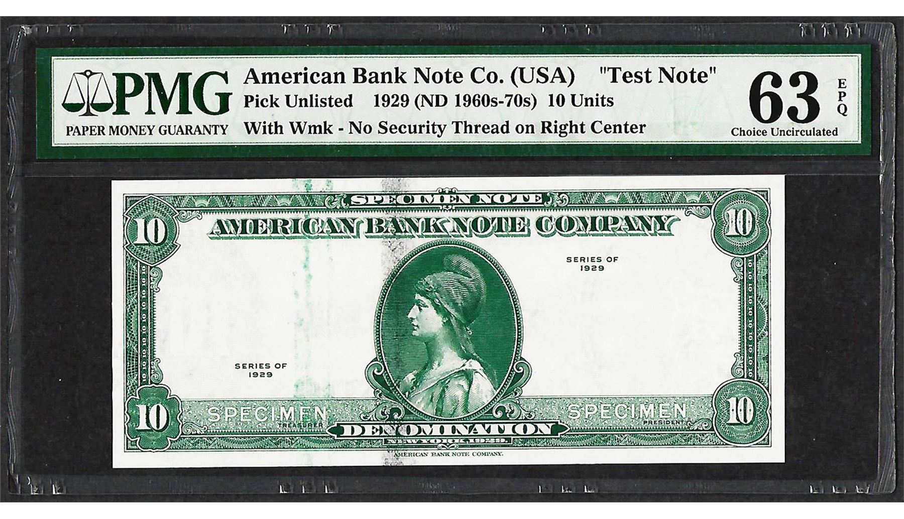 One 1929 10 Unit American Bank Note Co. "Test Note" PMG Choice Uncirculated 63EPQ. PMG Certified.