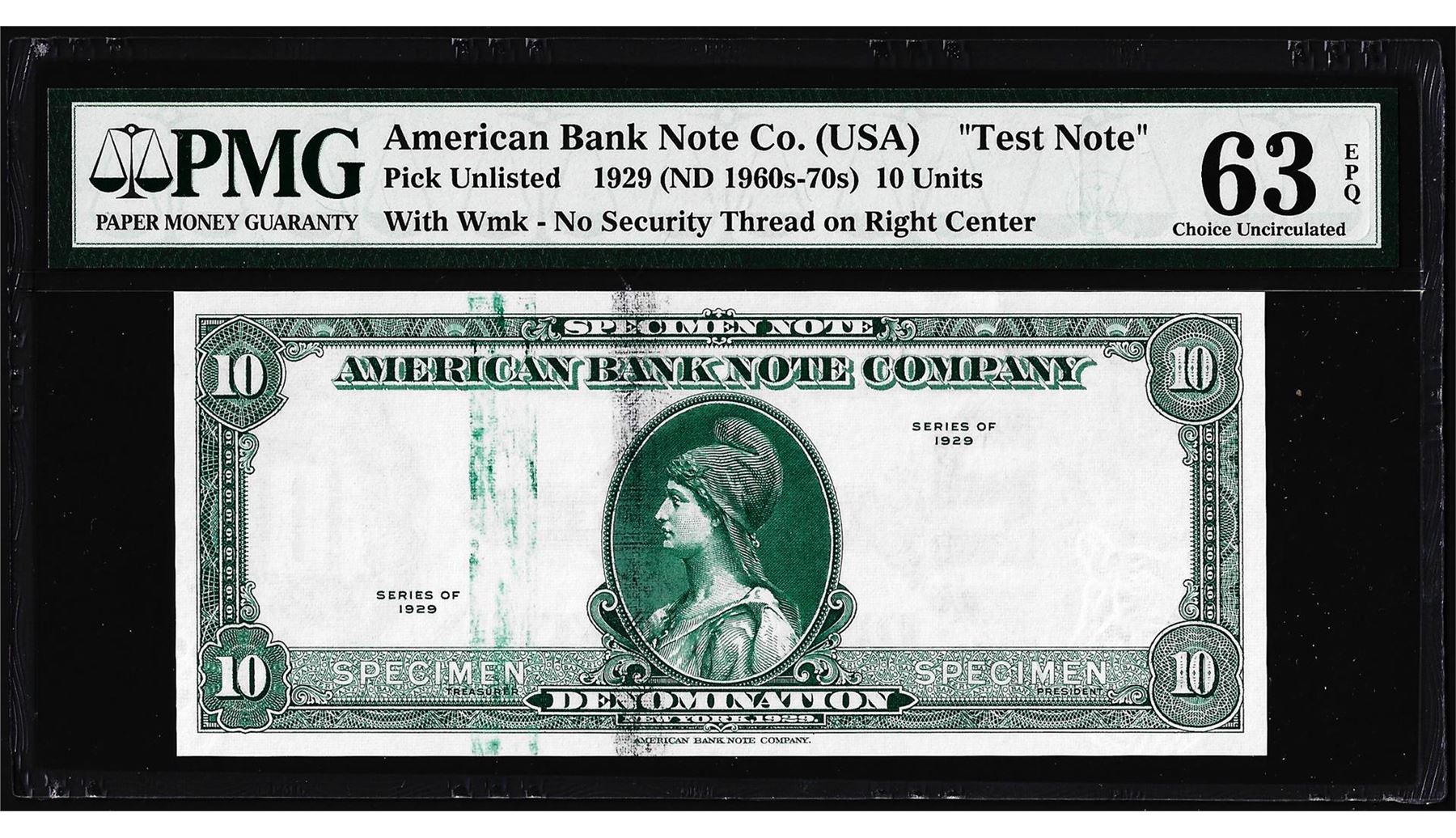 1929 10 Unit American Bank Note Co. "Test Note" PMG Choice Uncirculated 63EPQ