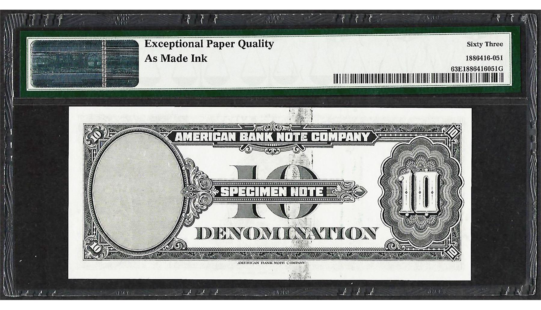 One 1929 10 Unit American Bank Note Co. "Test Note" PMG Choice Uncirculated 63EPQ. PMG Certified.