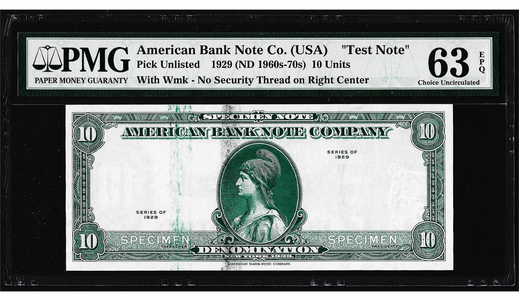 One 1929 10 Unit American Bank Note Co. "Test Note" PMG Choice Uncirculated 63EPQ. PMG Certified.