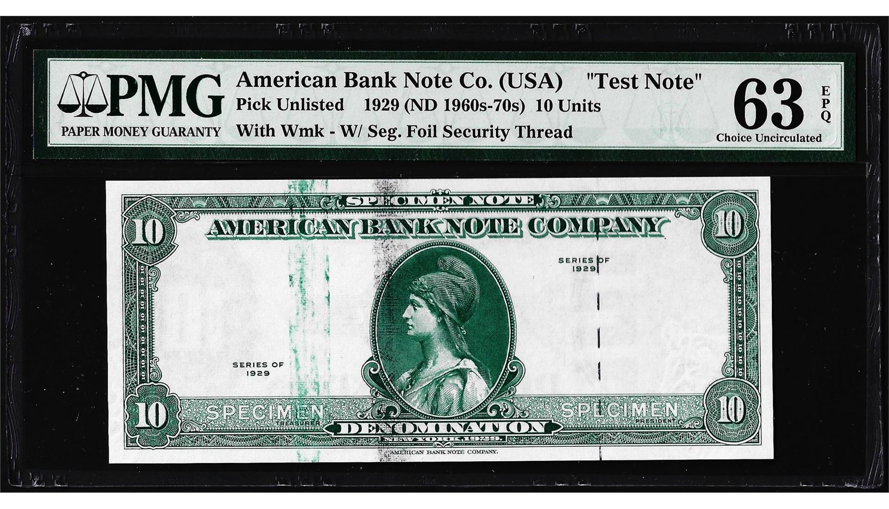 One 1929 10 Unit American Bank Note Co. "Test Note" PMG Choice Uncirculated 63EPQ. PMG Certified.