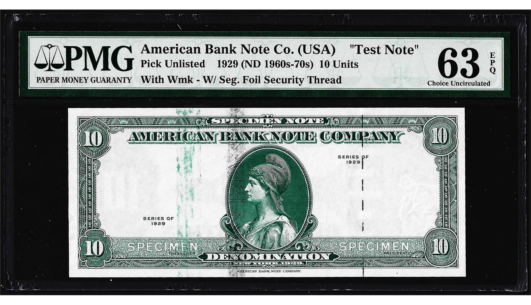 One 1929 10 Unit American Bank Note Co. "Test Note" PMG Choice Uncirculated 63EPQ. PMG Certified.