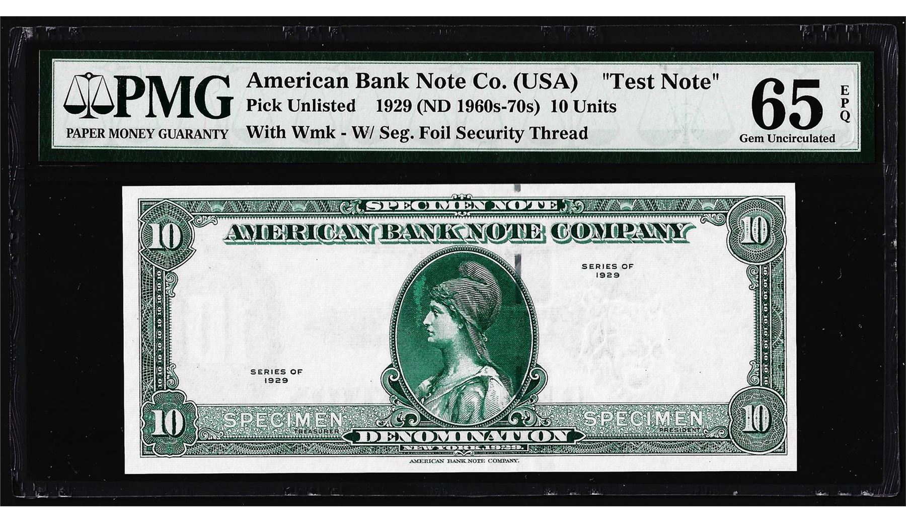 One 1929 10 Unit American Bank Note Co. "Test Note" PMG Gem Uncirculated 65EPQ. PMG Certified.