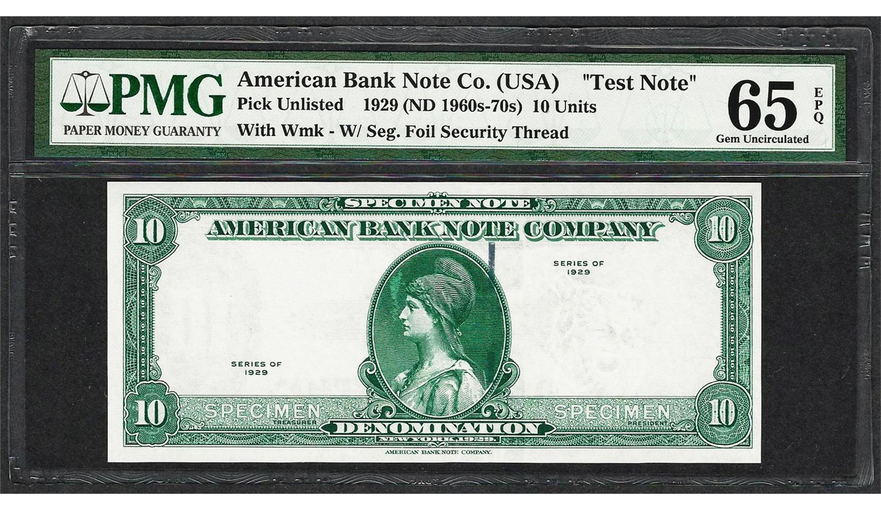 One 1929 10 Unit American Bank Note Co. "Test Note" PMG Gem Uncirculated 65EPQ. PMG Certified.