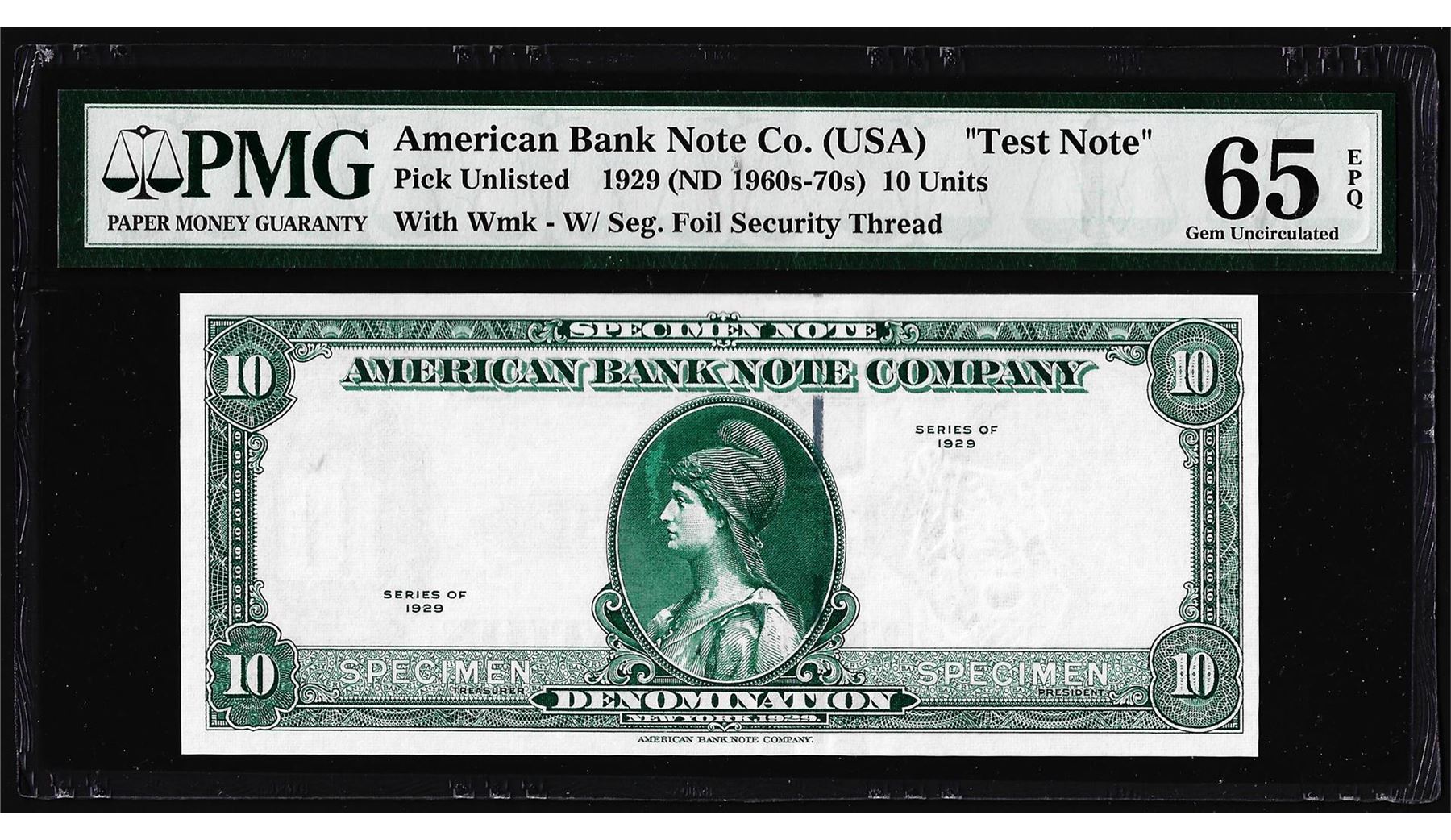 One 1929 10 Unit American Bank Note Co. "Test Note" PMG Gem Uncirculated 65EPQ. PMG Certified.