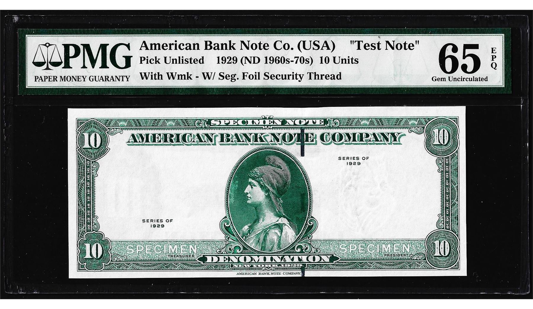 One 1929 10 Unit American Bank Note Co. "Test Note" PMG Gem Uncirculated 65EPQ. PMG Certified.