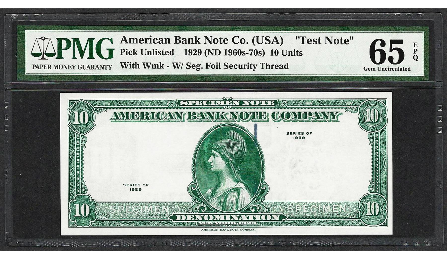 One 1929 10 Unit American Bank Note Co. "Test Note" PMG Gem Uncirculated 65EPQ. PMG Certified.