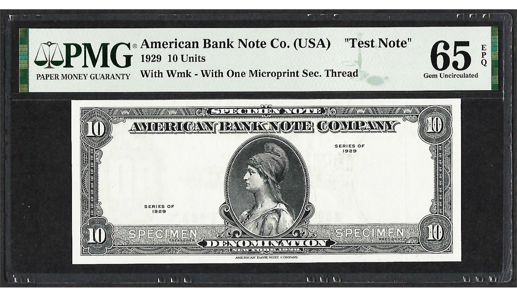 One 1929 10 Unit American Bank Note Co. "Test Note" PMG Gem Uncirculated 65EPQ. PMG Certified.