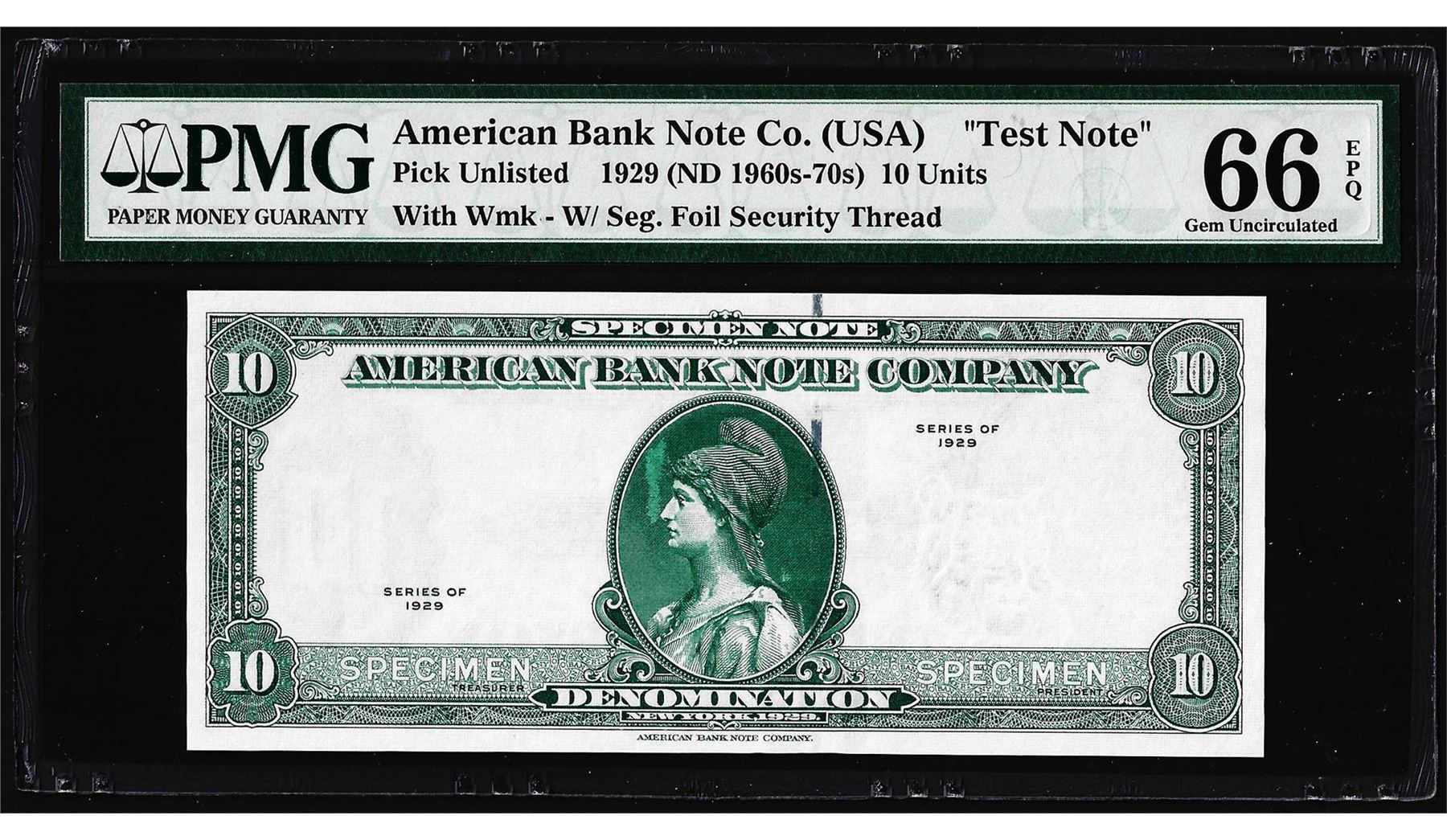 One 1929 10 Unit American Bank Note Co. "Test Note" PMG Gem Uncirculated 66EPQ. PMG Certified.