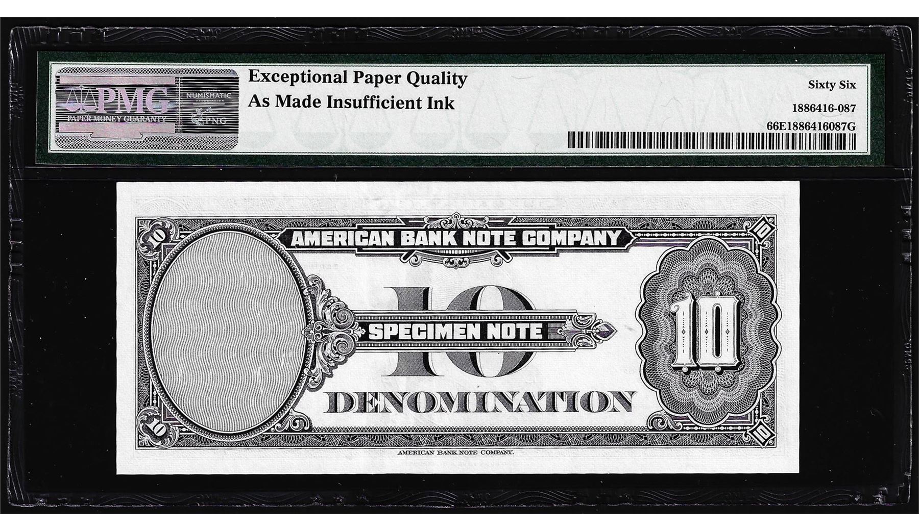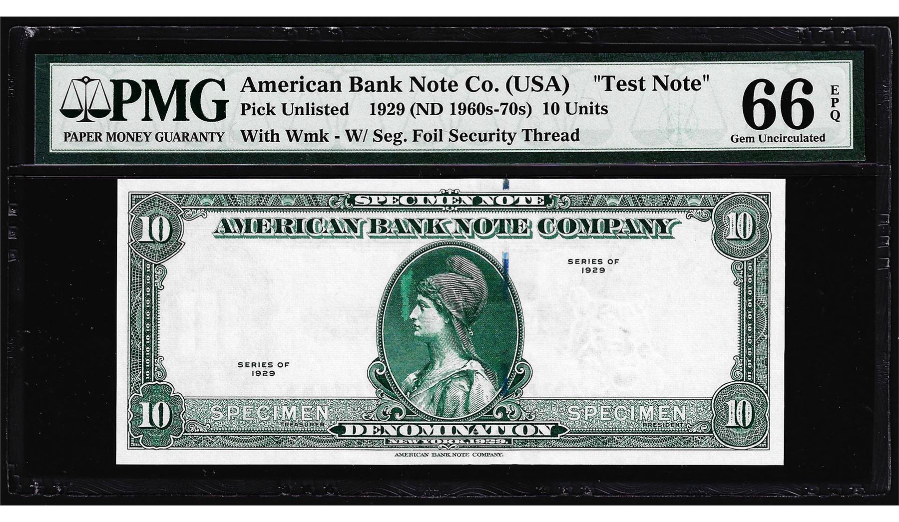 One 1929 10 Unit American Bank Note Co. "Test Note" PMG Gem Uncirculated 66EPQ. PMG Certified.