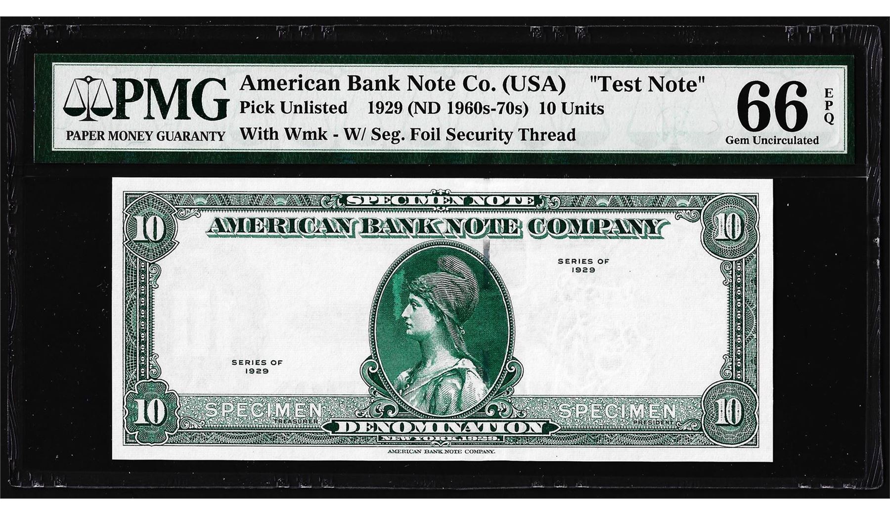 One 1929 10 Unit American Bank Note Co. "Test Note" PMG Gem Uncirculated 66EPQ. PMG Certified.