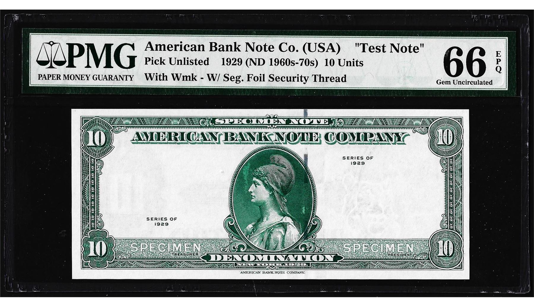 One 1929 10 Unit American Bank Note Co. "Test Note" PMG Gem Uncirculated 66EPQ. PMG Certified.