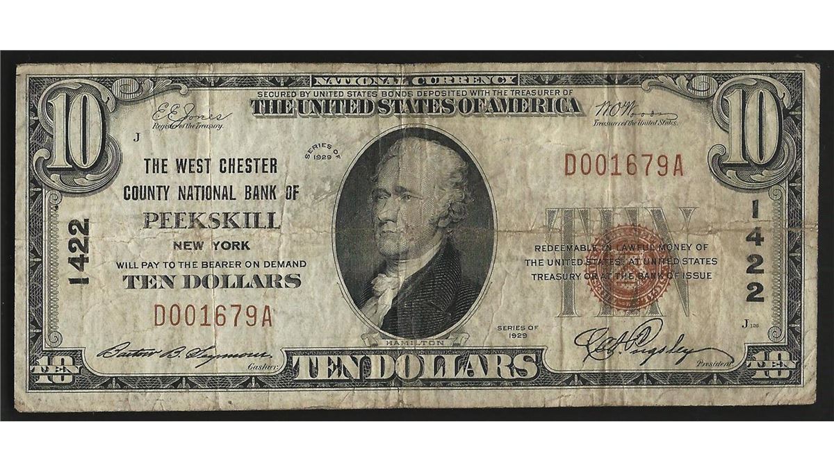 One 1929 $10 West Chester County National Bank of Peekskill New York National Currency Note.