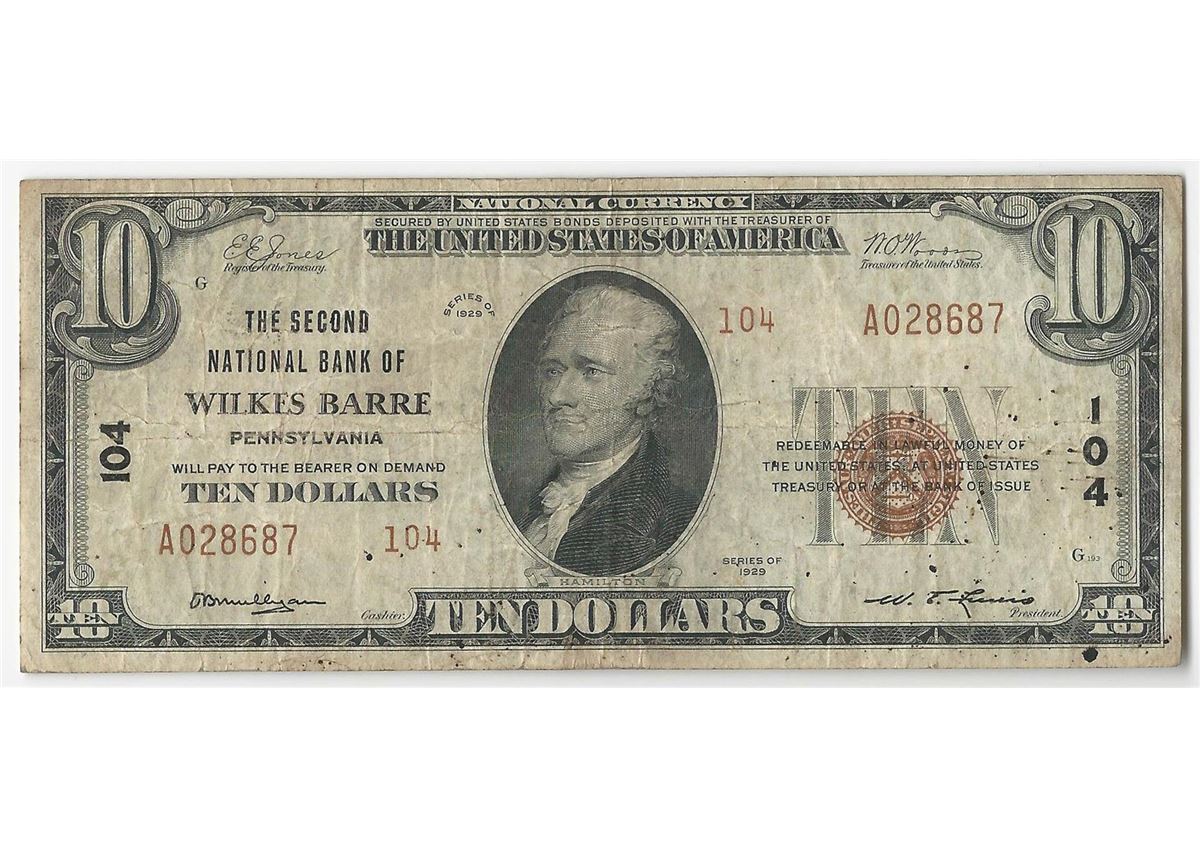 One 1929 $10 Wilkes Barre Pennsylvania National Currency Note.