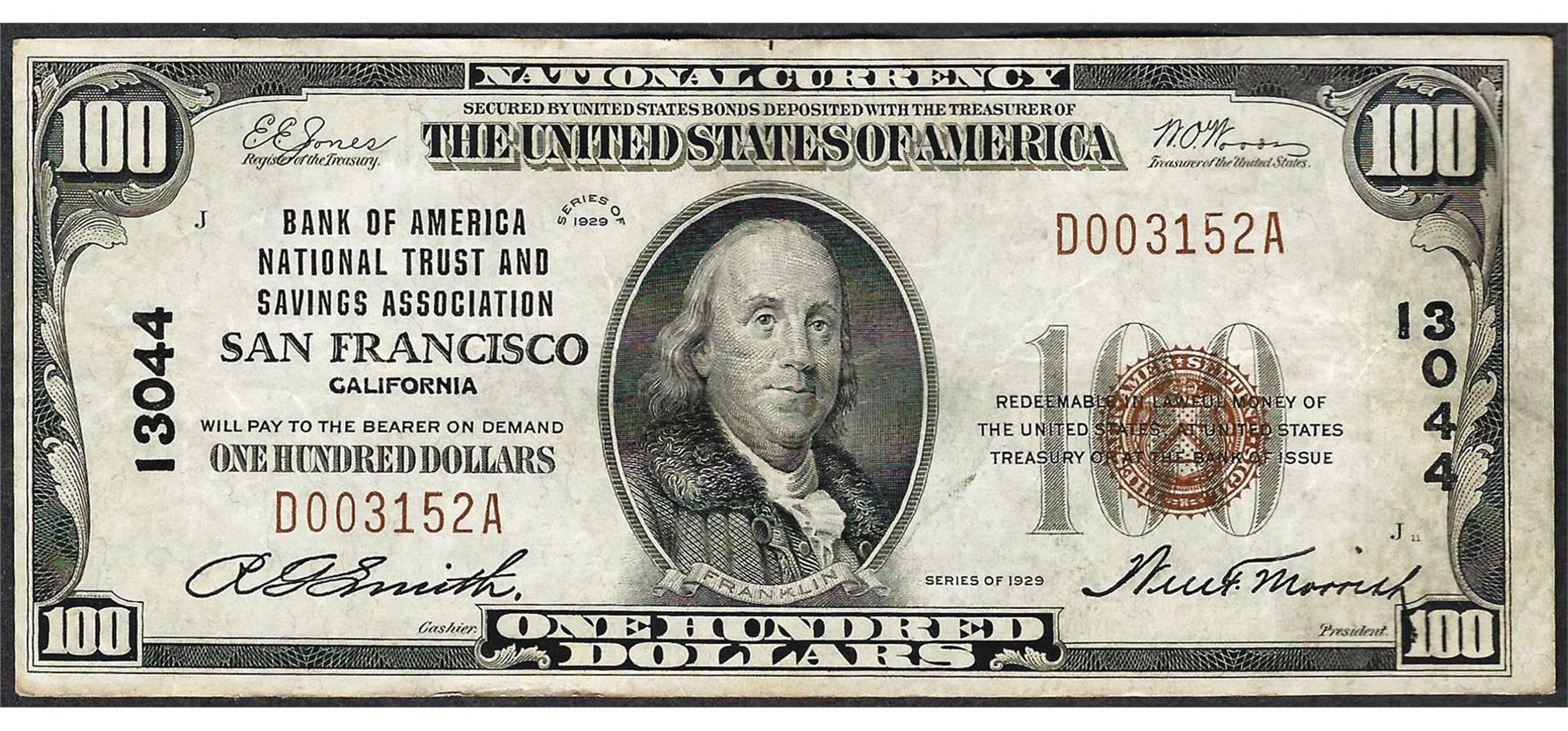 One 1929 $100 Bank of America National Trust & Savings San Francisco Note CH# 13044.