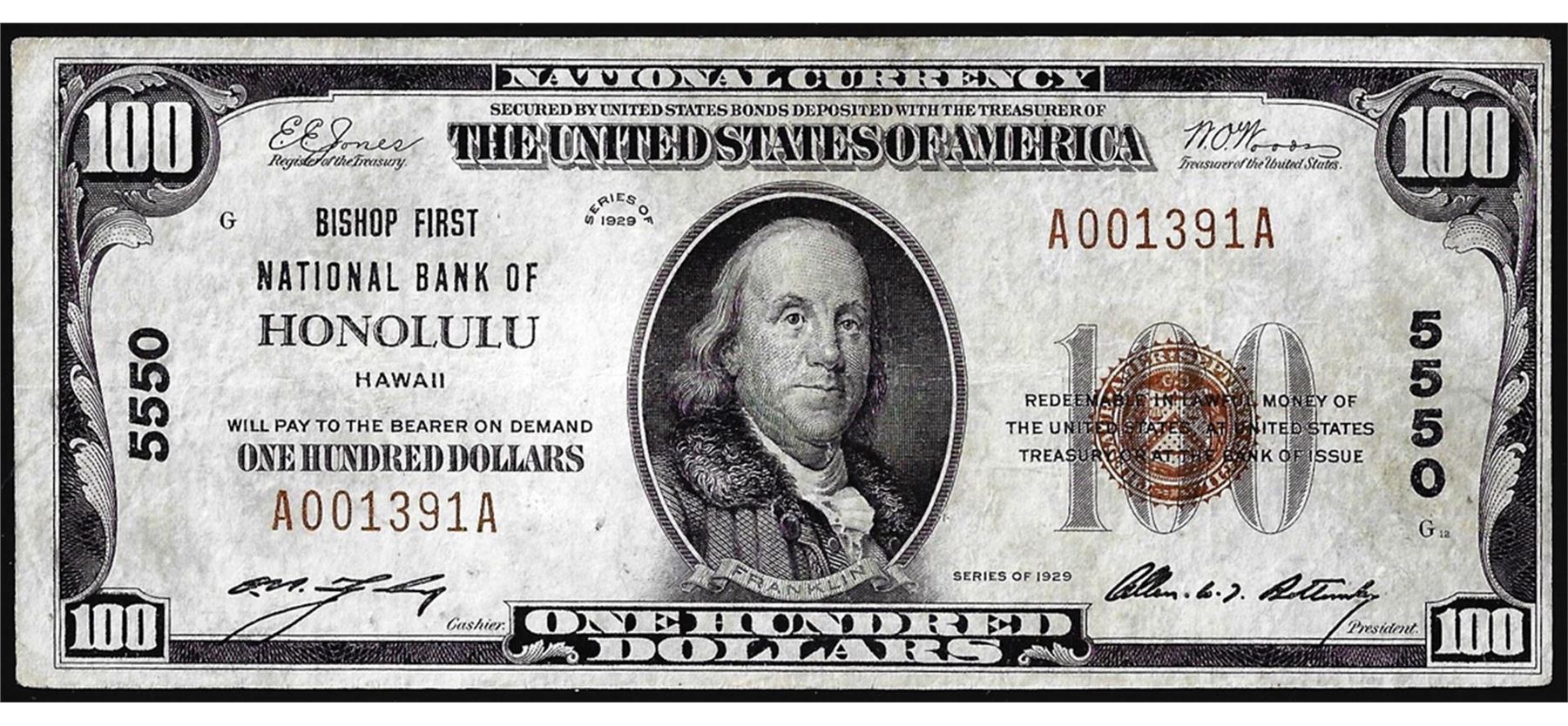 One 1929 $100 Bishop NB of Honolulu, HI CH# 5550 National Currency Note.