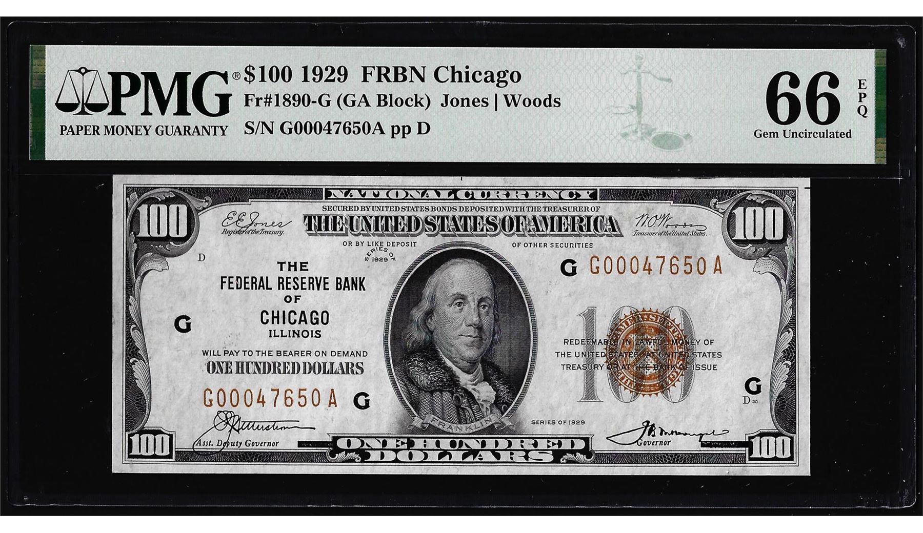 One 1929 $100 Federal Reserve Bank Note Chicago Fr.1890-G PMG Gem Uncirculated 66EPQ. PMG Certified.