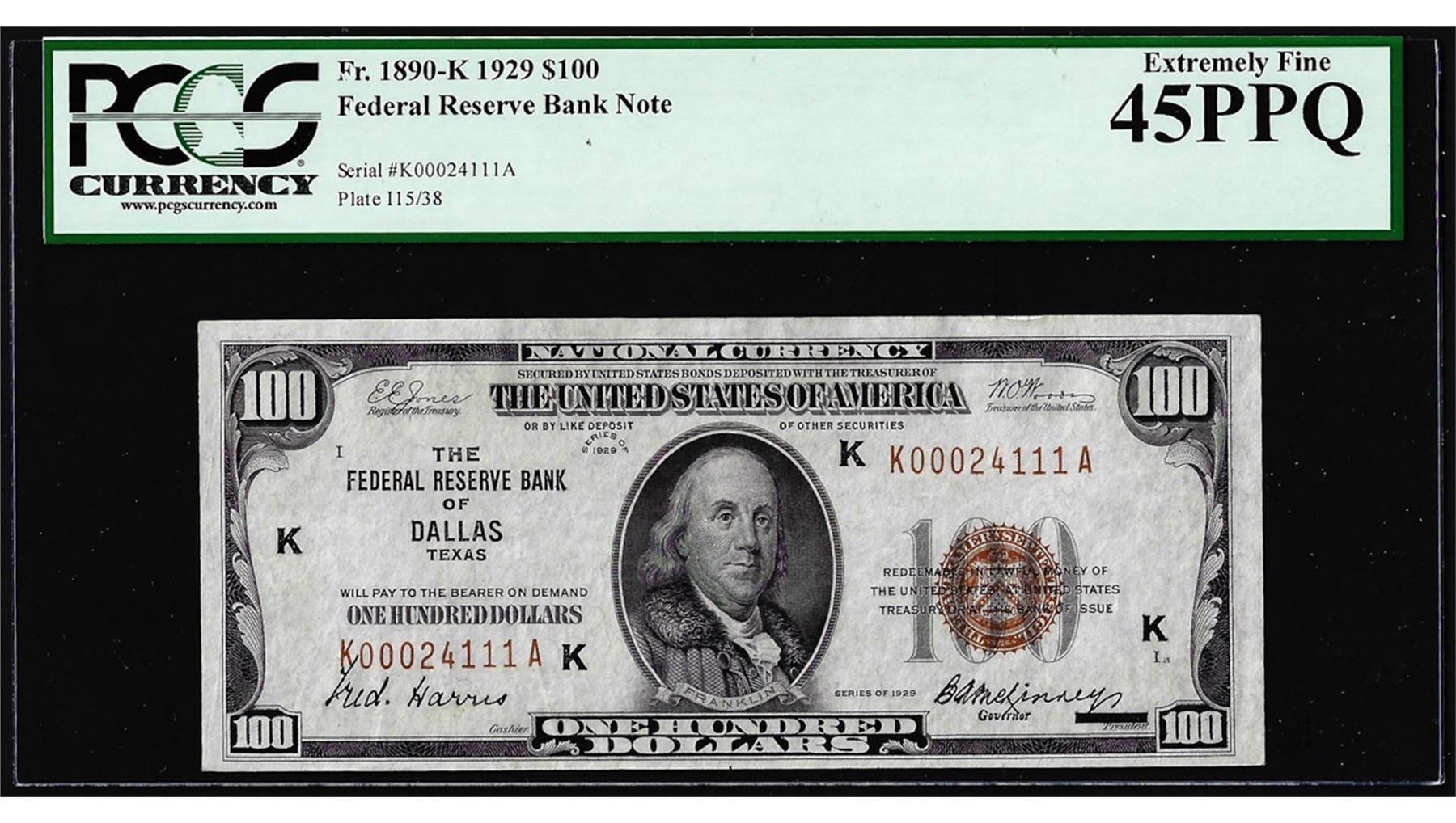 One 1929 $100 Federal Reserve Bank Note Dallas Fr.1890-K PCGS Extremely Fine 45PPQ. PCGS Graded.