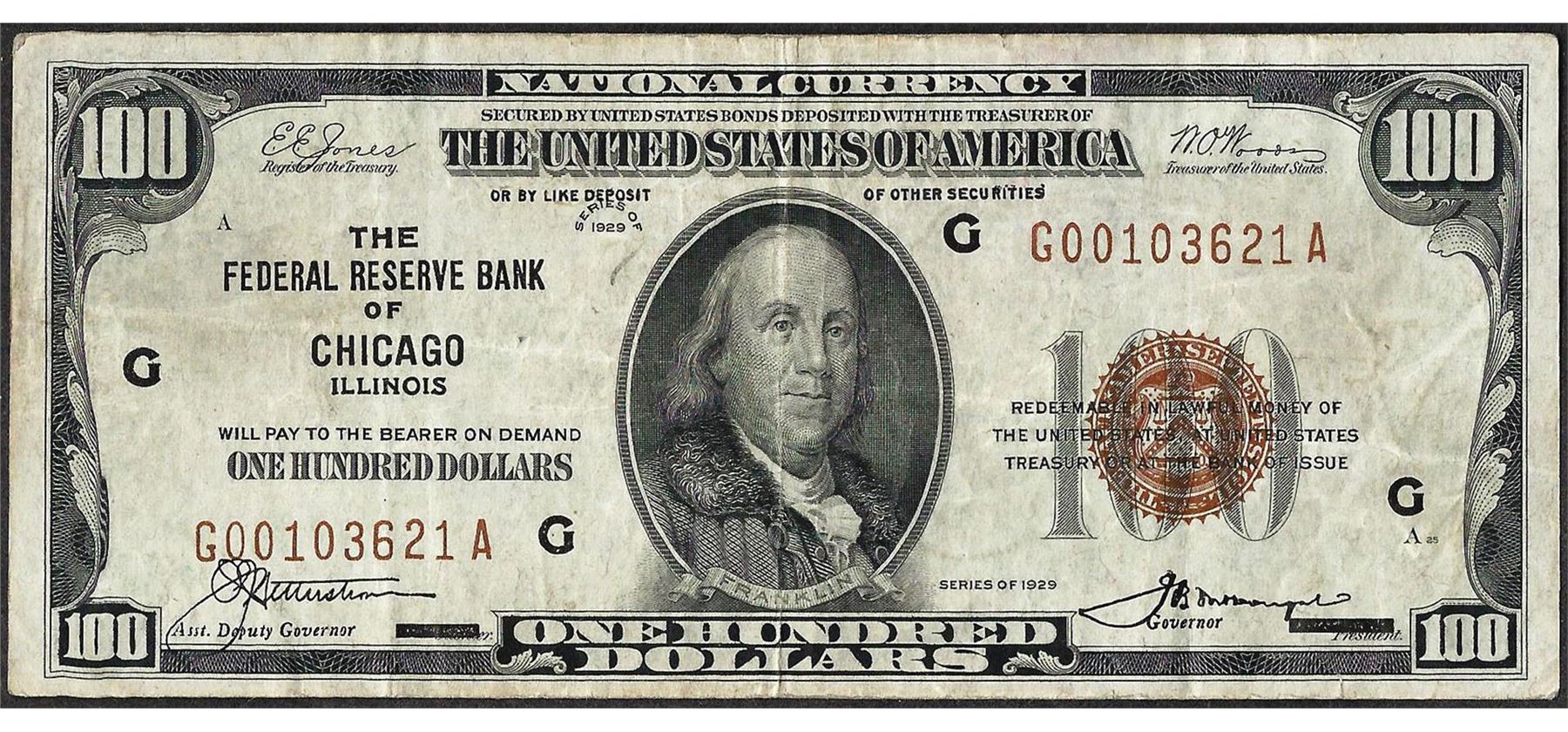 One 1929 $100 Federal Reserve Bank of Chicago Note.