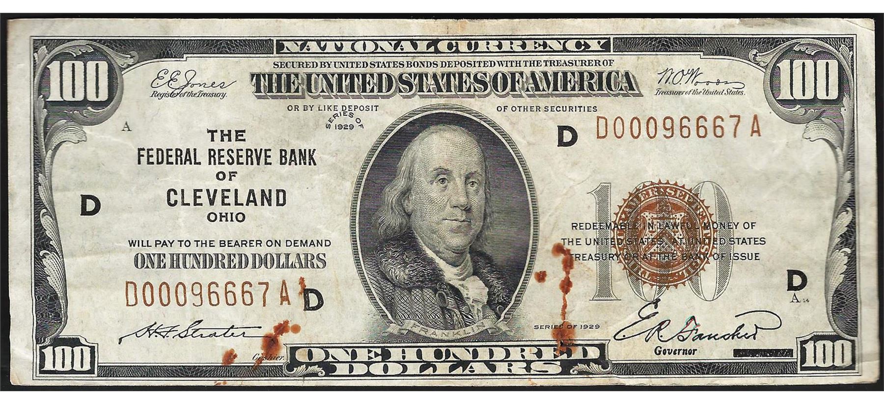 One 1929 $100 Federal Reserve Bank of Cleveland Currency Note.