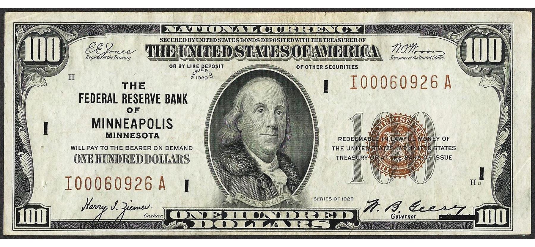One 1929 $100 Federal Reserve Bank of Minneapolis Note.