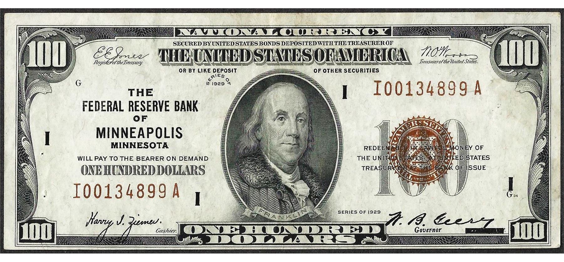 One 1929 $100 Federal Reserve Bank of Minneapolis Note.