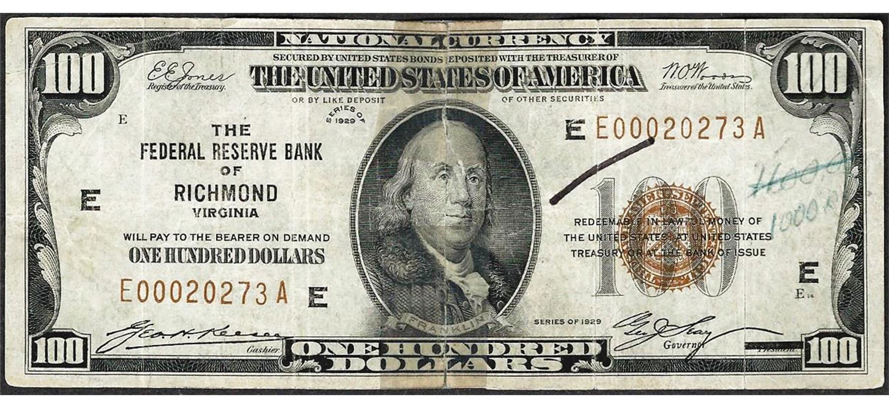 One 1929 $100 Federal Reserve Note Richmond Virginia.